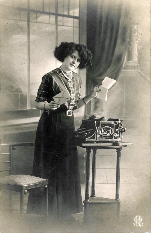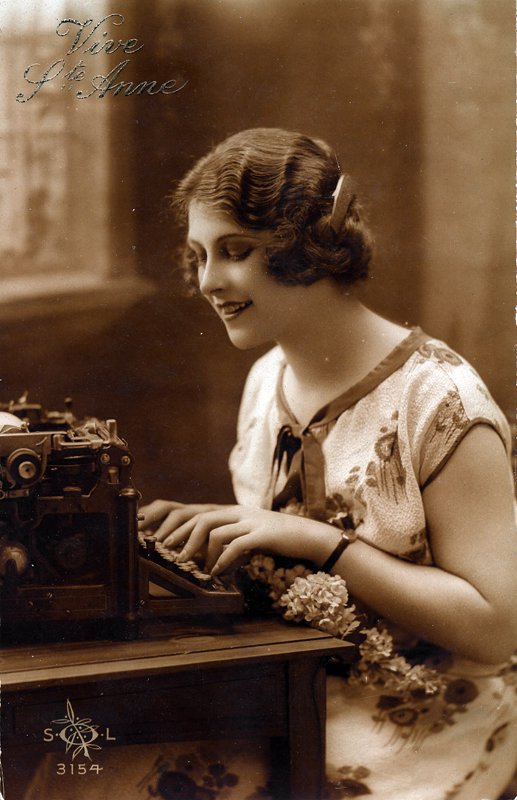 Sent from France in 1928. I don't know whether Vive Ste Anne was a person, a fashion company, or what, but the name has cropped up a few times on various postcards I've seen. It appears to be the same woman in all of them. Anyone out there know anything about Vive Ste Anne?Postmarked Viroqua, Wisconsin, in 1912, this scene featuring a Commercial Visible No.6 was probably an advertising giveaway for either a typewriter dealer or a service that provided typists to businesses. Other examples of this card do not feature the writing across the front, which is in a different hand than wrote the message on the back.