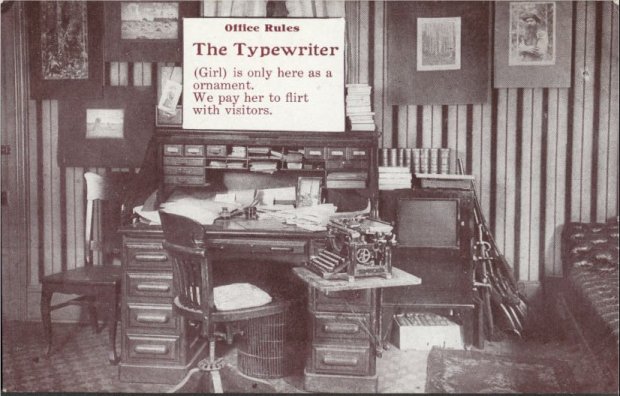 Old typewriter postcards often play off the pun that "typewriter" used to refer to the person (usually female) who used the writing instrument, not the machine itself.I want to know what kind of office this is that they have rifles stacked up in the corner.